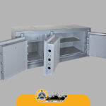 ابعاد خارجی : طول 180 ارتفاع 80 عمق 70 سانتیمتر ابعاد داخلی : قسمت یک ) طول 97 ارتفاع 60 عمق 48 سانتیمتر قسمت دو ) طول 47 ارتفاع 60 عمق 48 سانتیمتر مشخصات فنی : قسمت یک) یک عدد قفسه متحرک . دو عدد قفل مغزی دار کلید تاشو . یک عدد رمز مکانیکی . سیستم دسته هرز گرد . سیستم ضد سرقت قسمت دو) یک عدد دریچه .یک عدد قفل مغزی دارکلید تاشو . یک عدد رمز مکانیکی . سیستم دسته هرز گرد . وزن تقریبی : 1240 کیلوگرم
